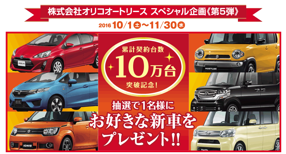 オリコオートリース10万台突破記念!お好きな新車をプレゼント!